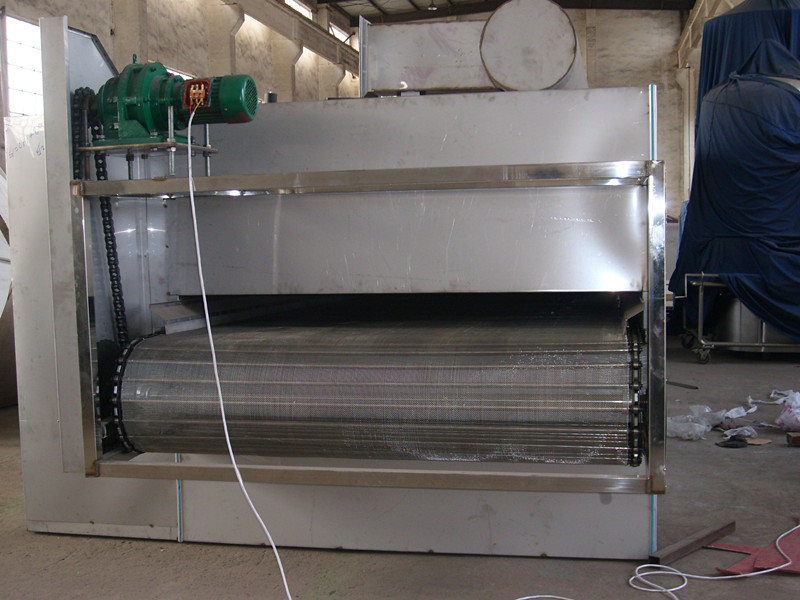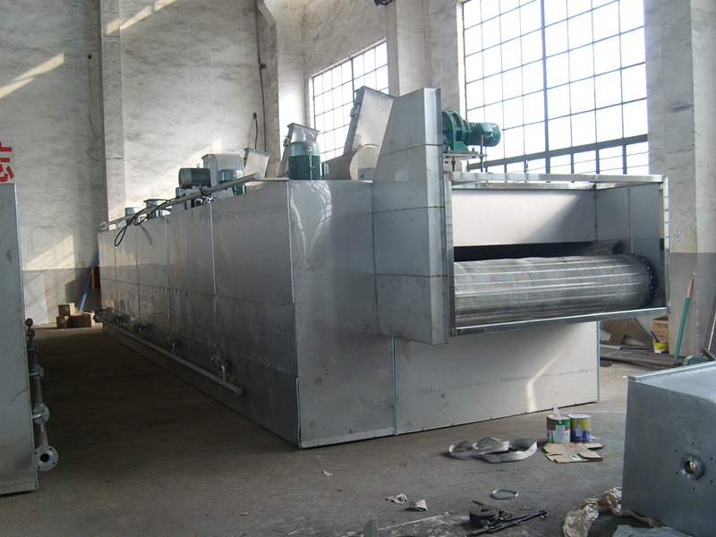 物料由加料器均勻地鋪在網(wǎng)帶上,網(wǎng)帶一般采用12-60目不銹鋼絲網(wǎng),由傳動裝置拖動在干燥機內(nèi)移動。干燥機由若干單元組成,每一單元熱風(fēng)獨立循環(huán),部分尾氣由專門排濕風(fēng)機排出,廢氣由調(diào)節(jié)閥控制,熱氣由下往上或由上往下穿過鋪滿物料的網(wǎng)帶完成熱量與質(zhì)量傳遞的進程,帶走物料水份。網(wǎng)帶緩慢移動,運行速度可根據(jù)物料溫度自由調(diào)節(jié),干燥后的成品連續(xù)落入收料器中。上下循環(huán)單元根據(jù)用戶需要可靈活配備,單元數(shù)量亦可根據(jù)需要選取。