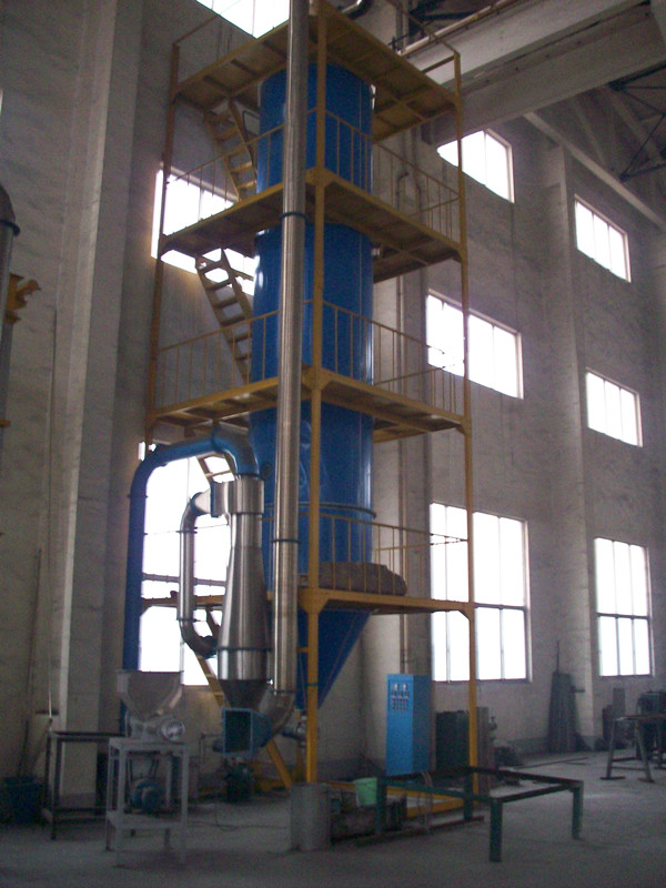 本機(jī)組工作過程為料液通過隔膜泵高壓輸入,噴出霧狀液滴,然后同熱空氣并流下降,大部分粉粒由塔底排料口收集,廢氣及其微小粉末經(jīng)旋風(fēng)分離器分離,廢氣由抽風(fēng)機(jī)排出,粉末由設(shè)在旋風(fēng)分離器下端的授粉筒收集,風(fēng)機(jī)出口還可裝備二級(jí)除塵裝置,回收率在96-98%以上。