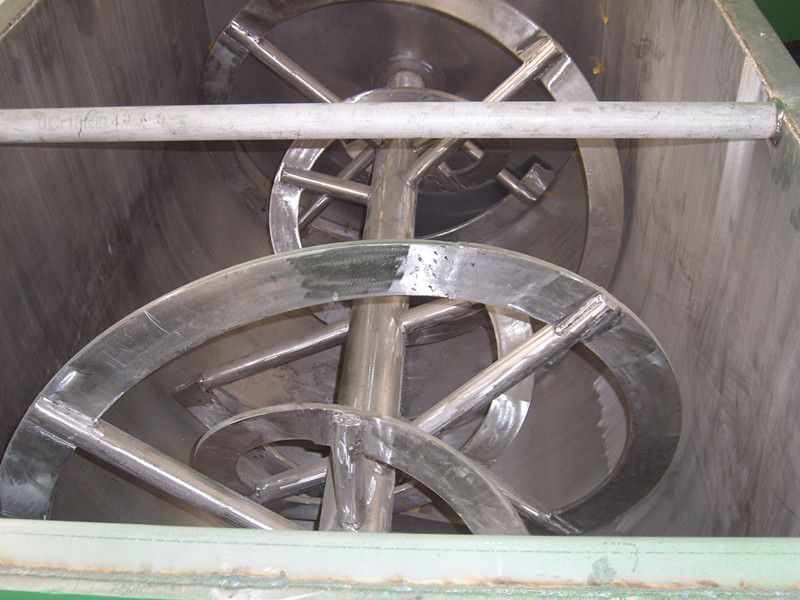 該機(jī)型由容器、螺旋攪拌葉片和傳動(dòng)部件組成:螺旋葉片一般做成雙層或三層,外層螺旋將物料從兩側(cè)向中央?yún)R集,內(nèi)層螺旋將物料從中央兩側(cè)輸送,形成對(duì)流混合。