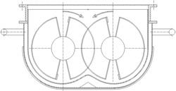 其外殼使用底部為圓形,上部為矩形,殼內(nèi)排列有2-4根空心攪拌軸,軸與殼體間有密封端蓋。上蓋體