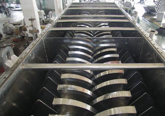 槳葉干燥設備經(jīng)互相嚙合的二到四根槳葉軸、帶有夾套的W形殼體、機座以及傳動部分組成,物料的整個干燥流程在封閉狀態(tài)下進行,有機揮發(fā)氣體及異味氣體在密閉氛圍下送至尾氣處理裝置,避免環(huán)境污染。