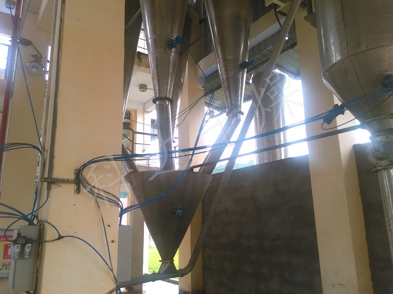 具備強(qiáng)吸濕性的物料在干燥流程容易粘結(jié)在干燥器的壁面上,特別是在沒(méi)有干透的情況下更容易粘結(jié)到壁面(干燥塔內(nèi)壁、旋風(fēng)內(nèi)壁等),另外出料口位置出料難,例如塔下出料口、旋風(fēng)出料口,由于系統(tǒng)均為負(fù)壓狀態(tài),出料口位置也是冷風(fēng)漏風(fēng)最厲害的地方(冷風(fēng)漏到系統(tǒng)內(nèi)),冷風(fēng)與干粉接觸,就會(huì)導(dǎo)致干粉吸濕,因此在各個(gè)出料口位置均不能設(shè)置轉(zhuǎn)動(dòng)部件,如旋轉(zhuǎn)卸料閥等。