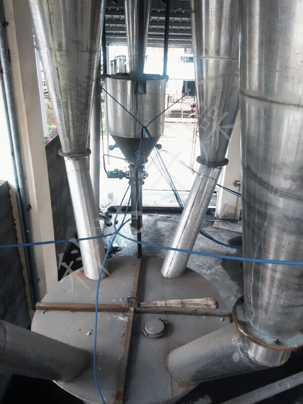 干燥流程完成后,干燥產(chǎn)品懸浮在空氣中,對(duì)離開(kāi)干燥室的空氣中所帶出的干燥產(chǎn)品,一定要有效地加以分散及收回;以保證干燥流程能求得最高產(chǎn)量和防止粉料逸到高氣中造成空氣污染。本機(jī)使用一次性收料系統(tǒng)。干成品與空氣的混合物由內(nèi)置旋風(fēng)分散后使產(chǎn)品從干燥室底部出來(lái)后降落到振動(dòng)冷卻收料器(冷卻效率≤75)部分產(chǎn)品進(jìn)入旋風(fēng)分散器,由分散后,成品干粉經(jīng)設(shè)在旋風(fēng)分散器下部收料筒收集,含有少量微塵的廢氣從旋風(fēng)分散器上部出來(lái)后進(jìn)入濕式除塵器,由除塵凈化后經(jīng)排風(fēng)機(jī)由煙囪排入高氣(需安裝冷凝段)